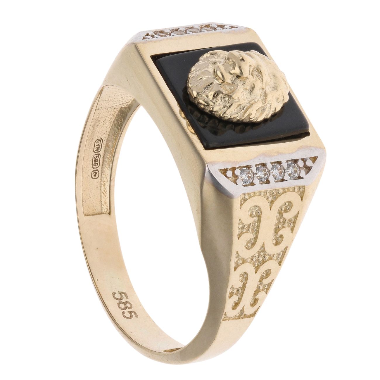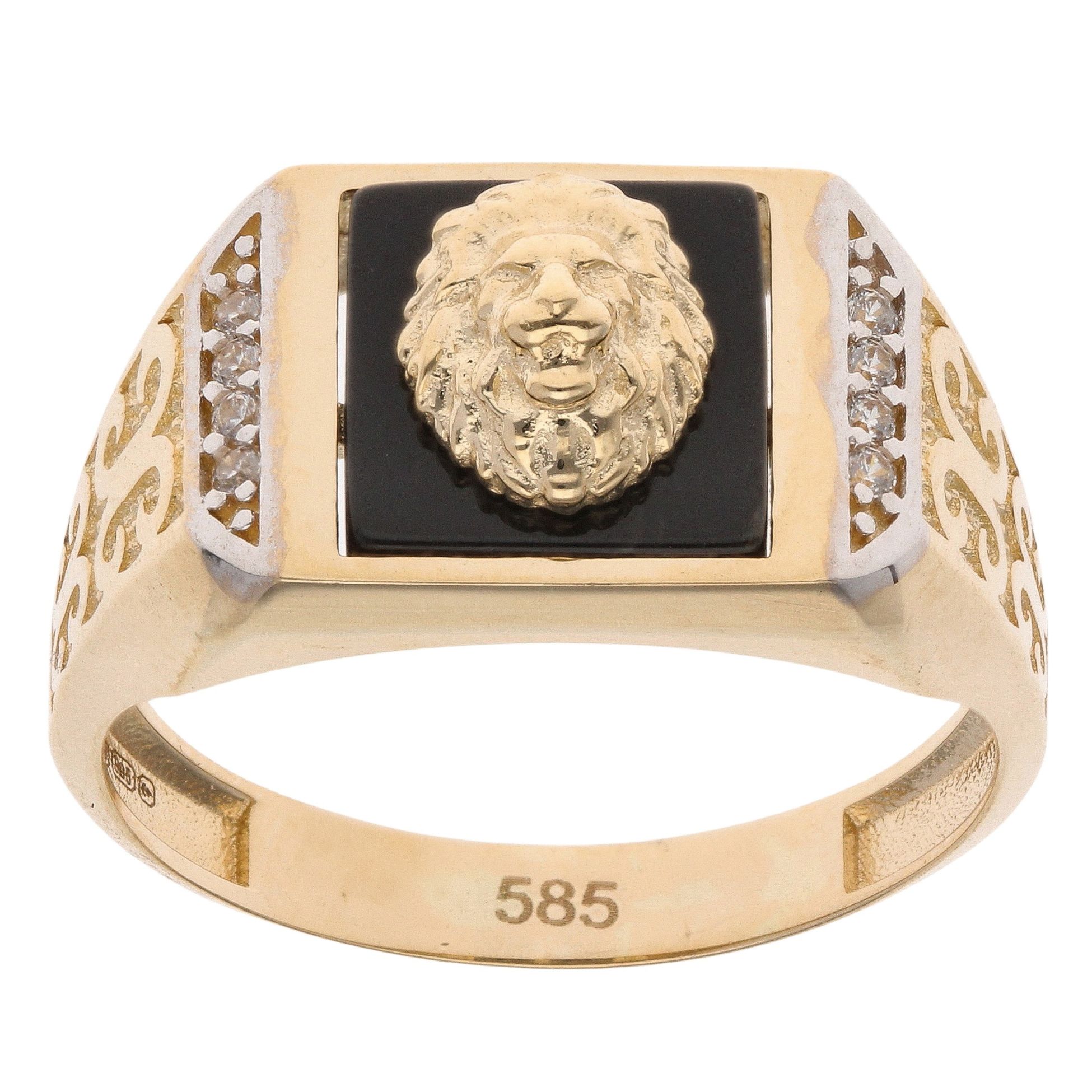 14ct Yellow and White Gold Cubic Zirconia and Black Enamel Lion Head Patterned Square Signet Ring