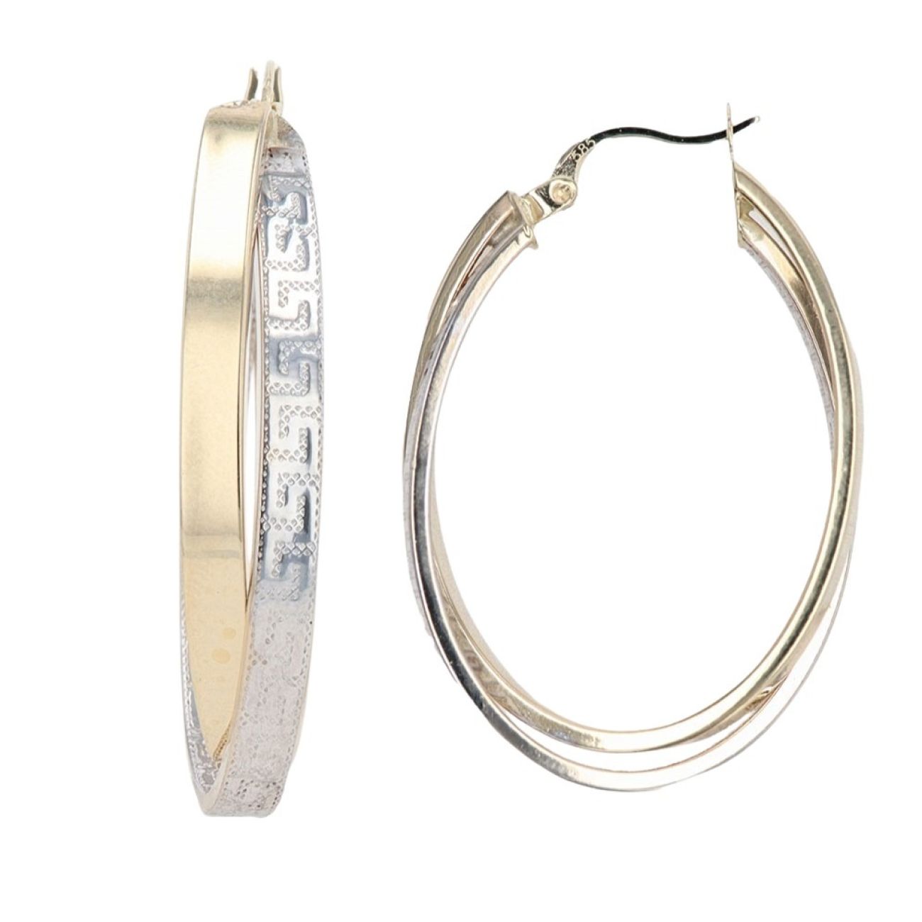 14ct Yellow and White Gold Greek Key Double Oval Hoop Earrings