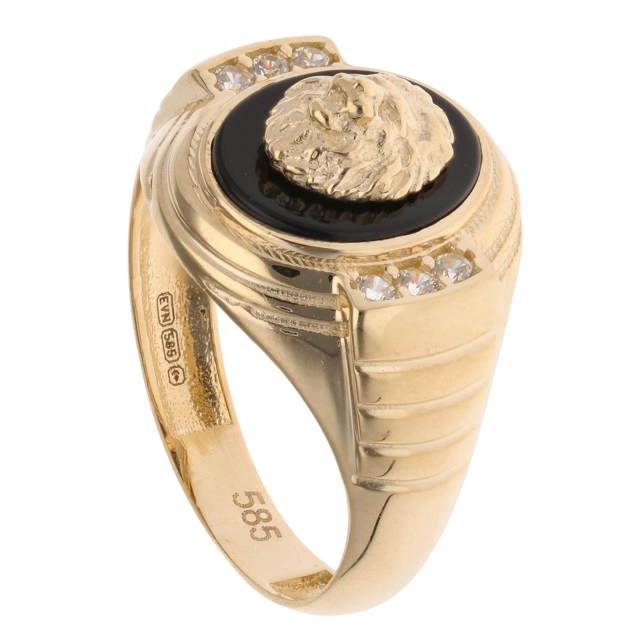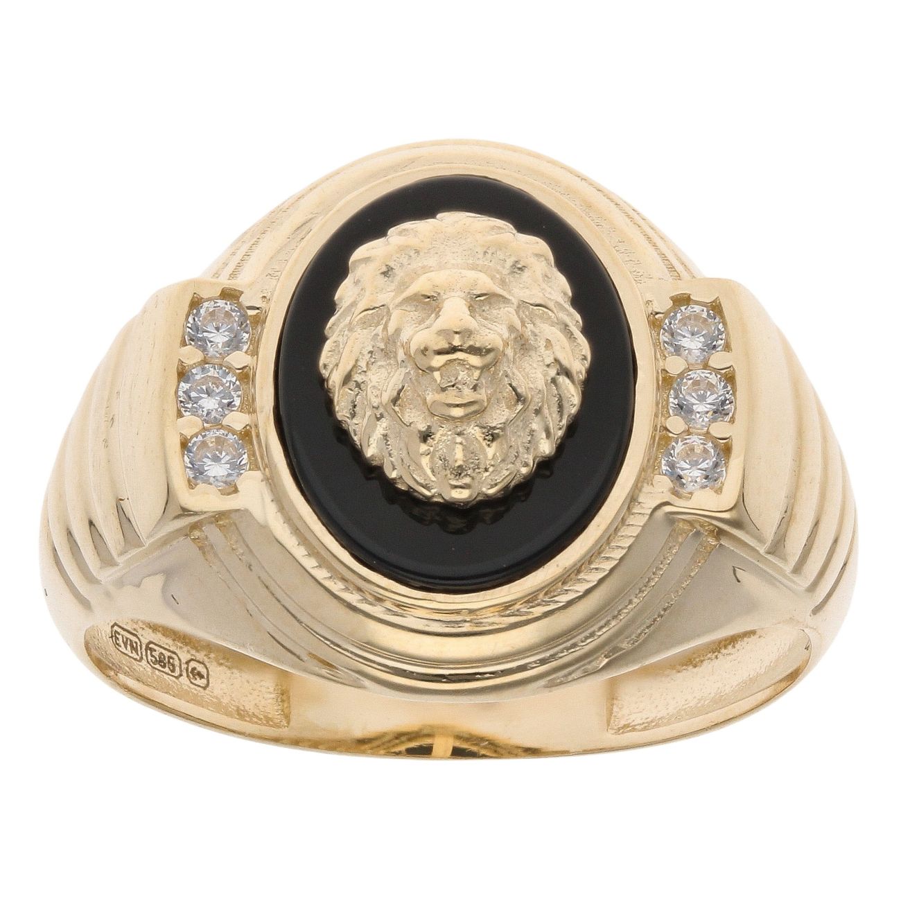14ct Yellow Gold Cubic Zirconia and Black Enamel Lion Head Oval Signet Ring