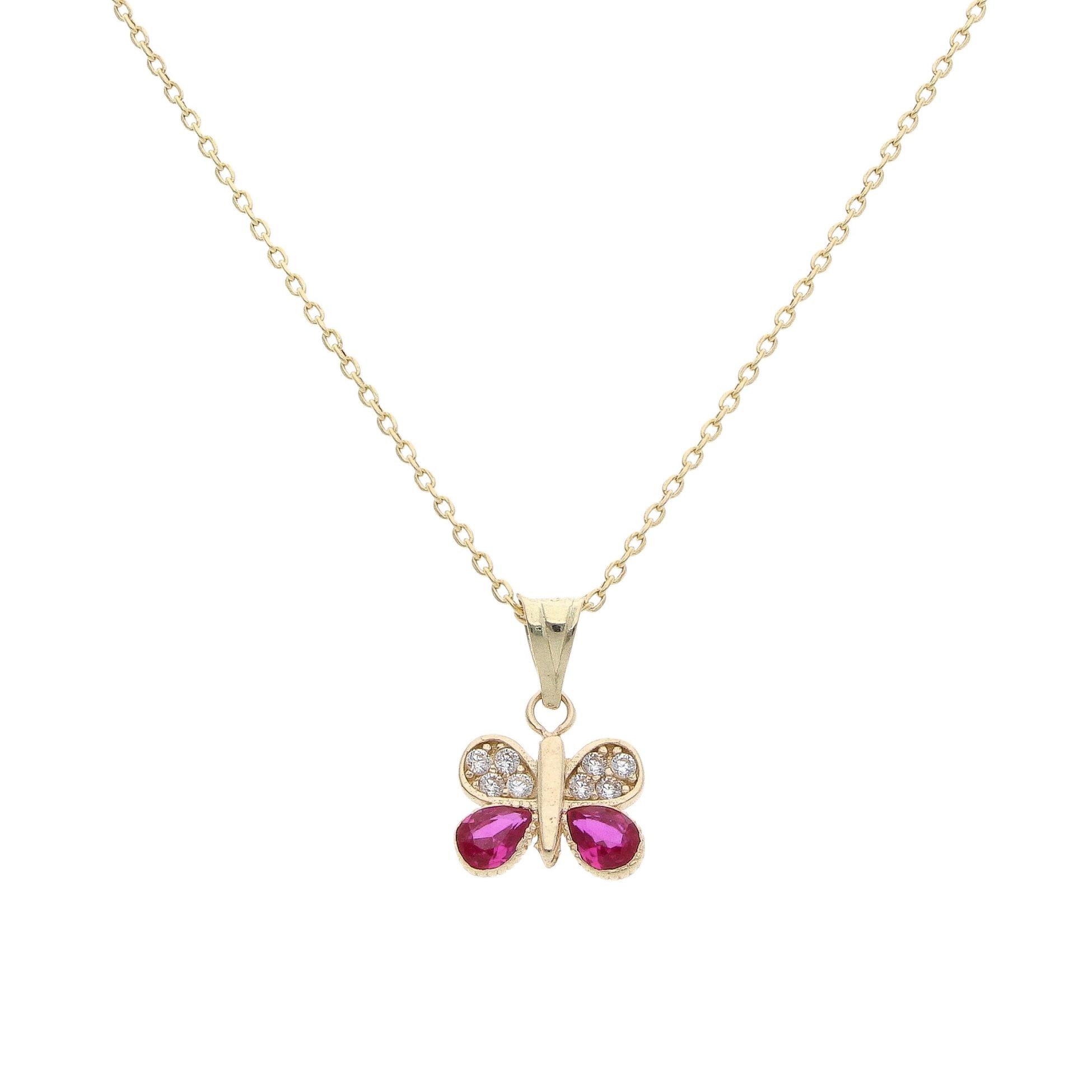 14ct Yellow Gold Cubic Zirconia and Red Gem Butterfly Pendant and Chain 18"