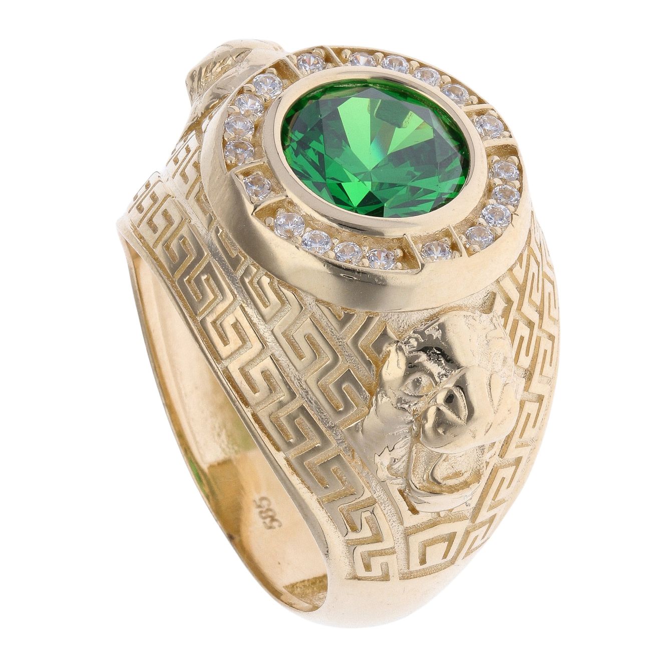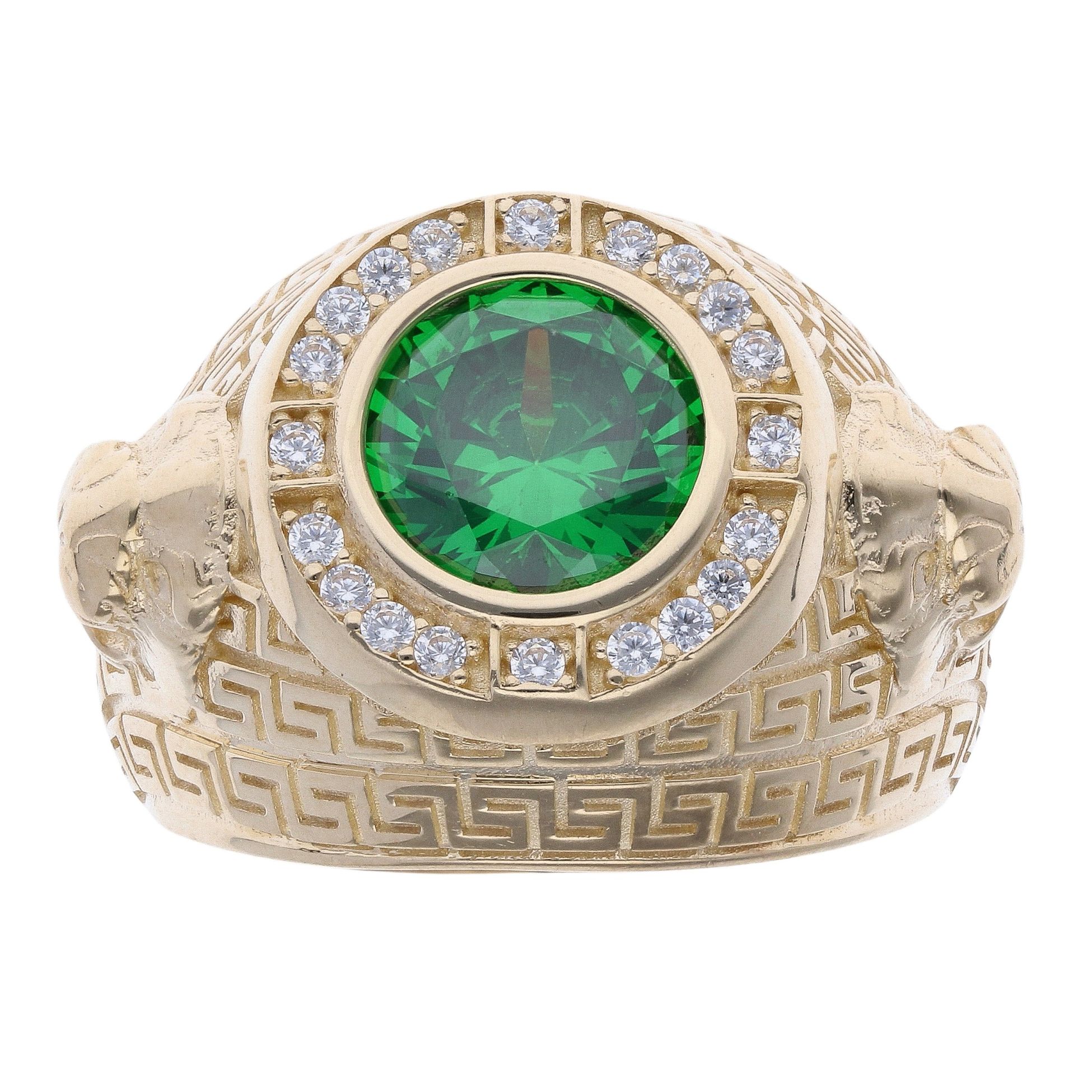 14ct Yellow Gold Green Gemstone Lion And Greek Key Signet Ring