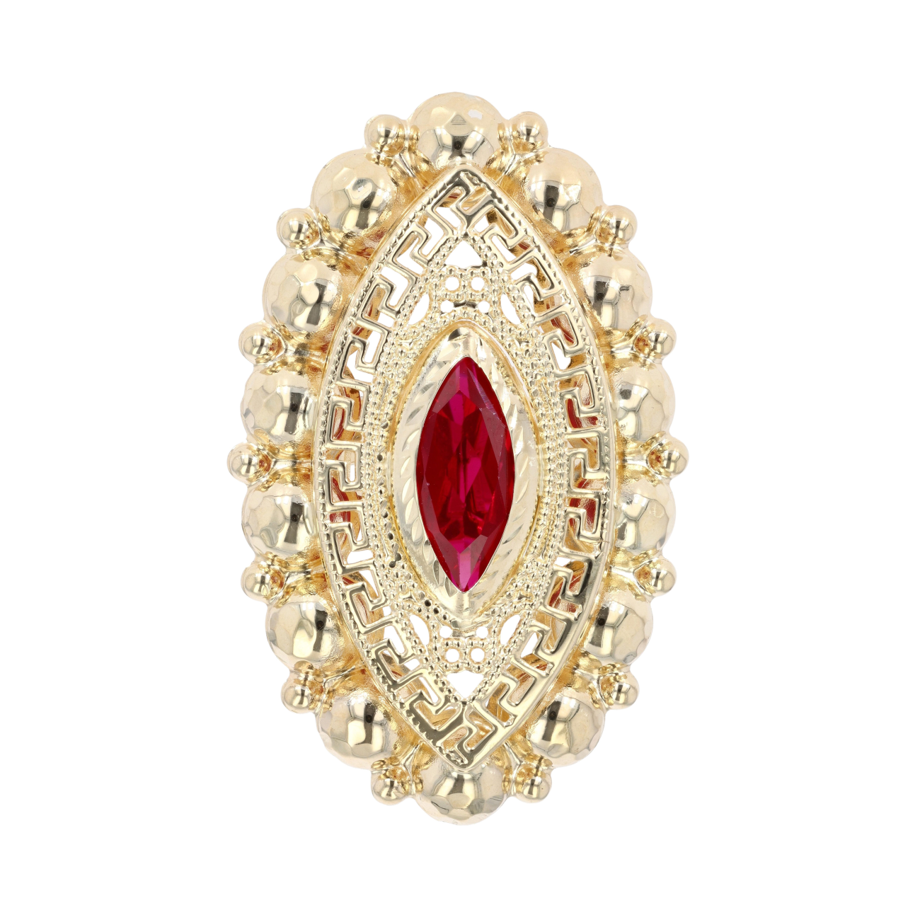 14ct Yellow Gold Red Gemstone Greek Key Marquise Ring