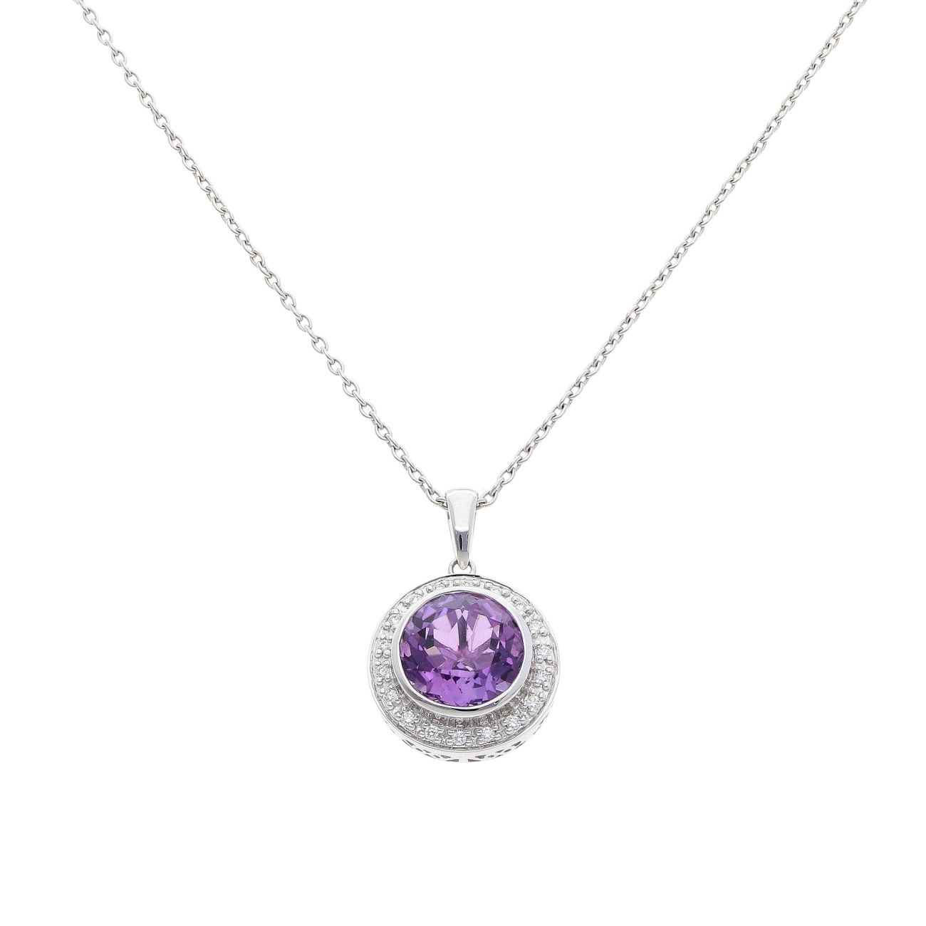 18ct White Gold 0.15ct Diamonds And Amethyst Solitaire Pendant and Chain 18"