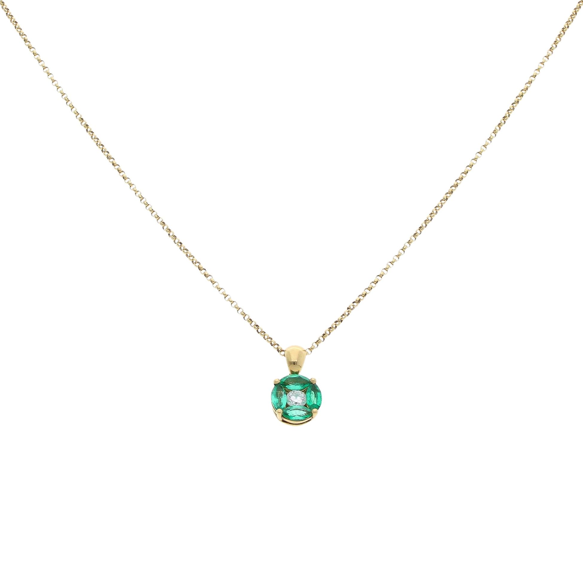 18ct Yellow Gold 0.10ct Brilliant Cut Diamond And Emerald Cluster Pendant And Chain 16"