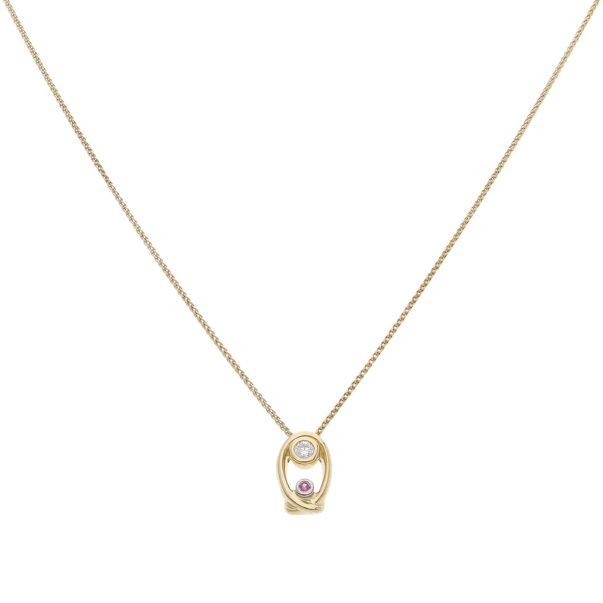 18ct Yellow Gold 0.10ct Brilliant Cut Diamond And Pink Gemstone Pendant And Chain 18"
