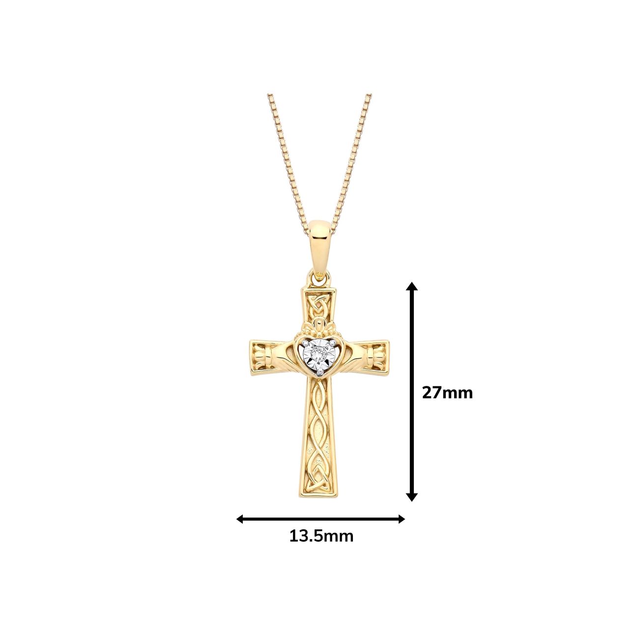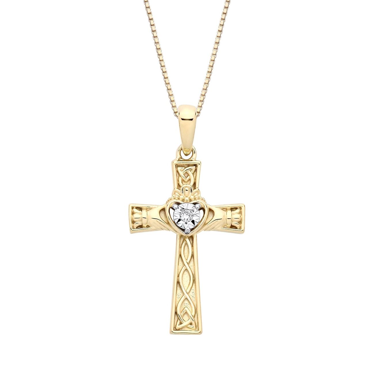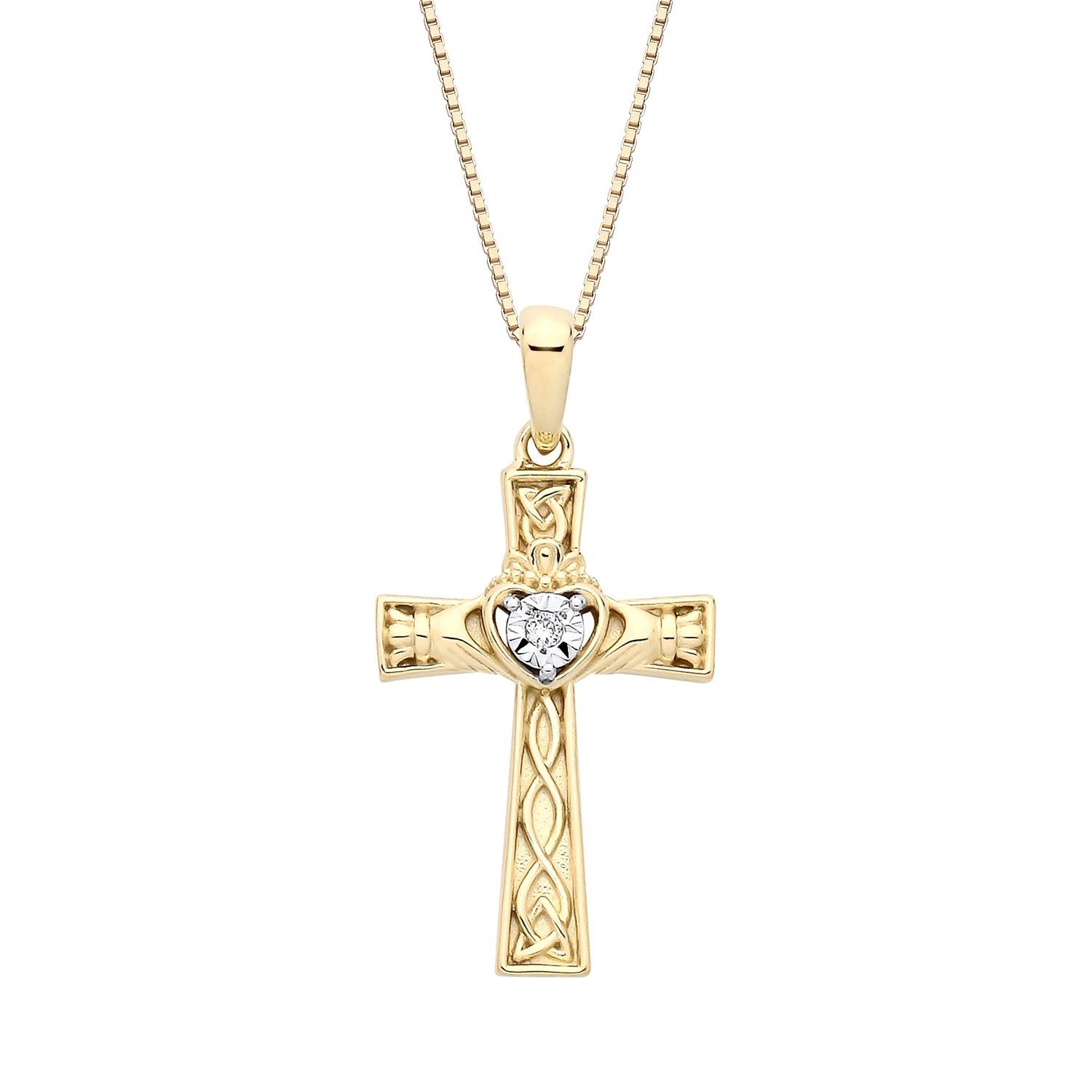 18ct Yellow Gold on Sterling Silver Diamond Celtic Claddagh Cross Pendant Necklace