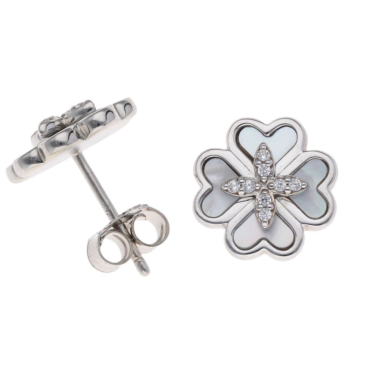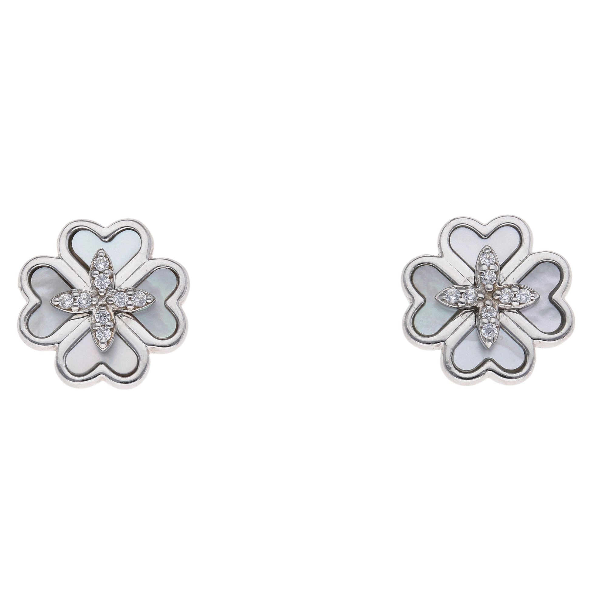 925 Sterling Silver Mother Of Pearl And Cubic Zirconia Leaf Clover Stud Earrings