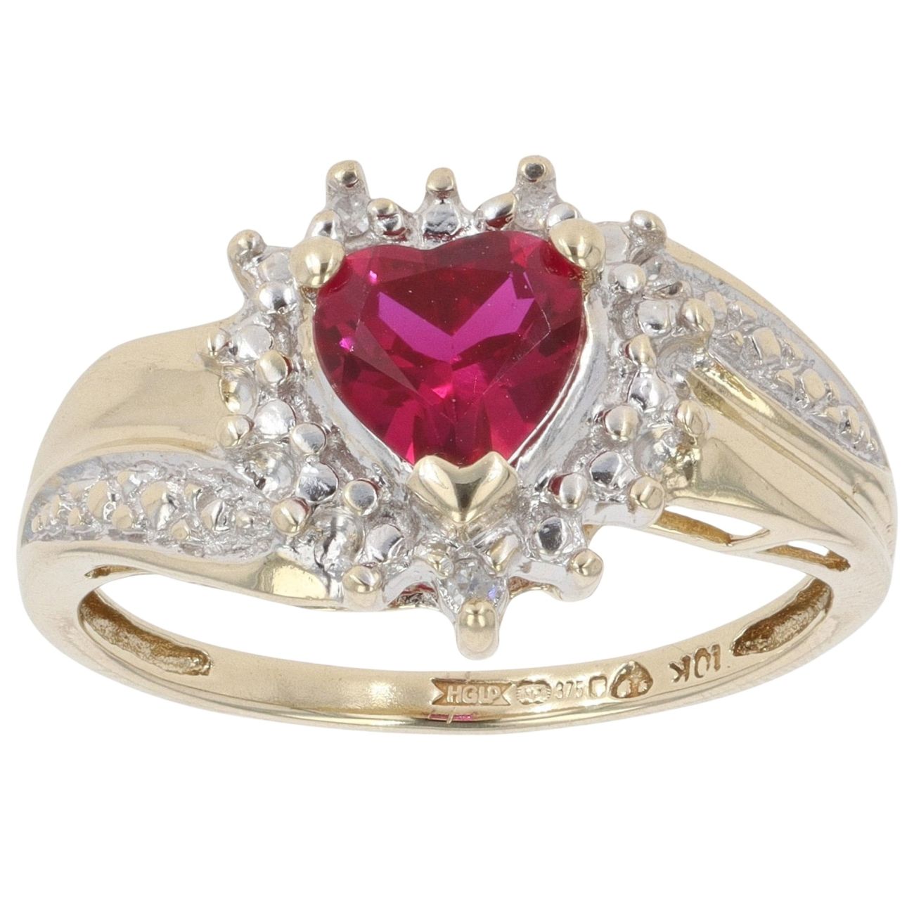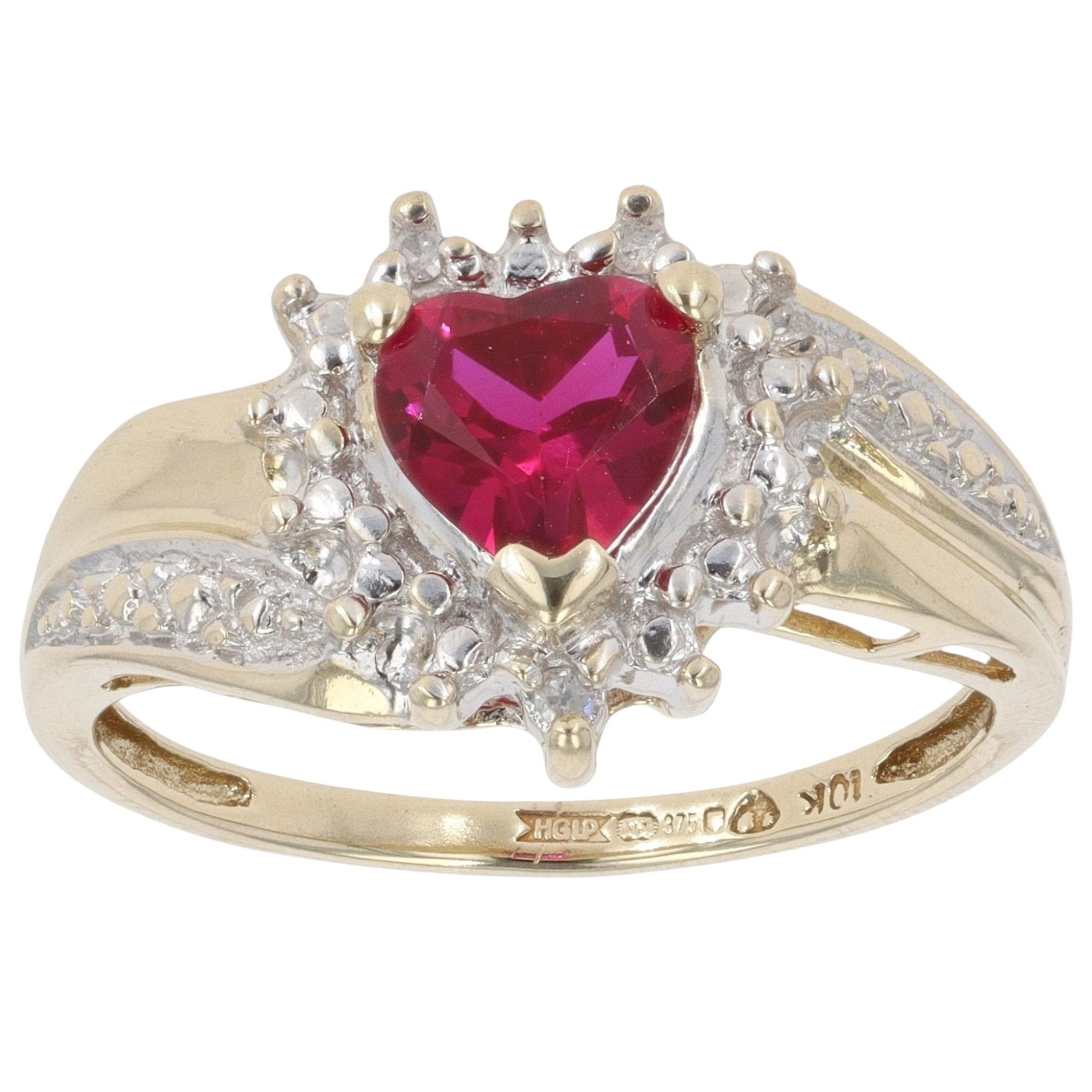 9ct Yellow and White Gold 0.05ct Diamond and Created Ruby Heart Cluster Ring