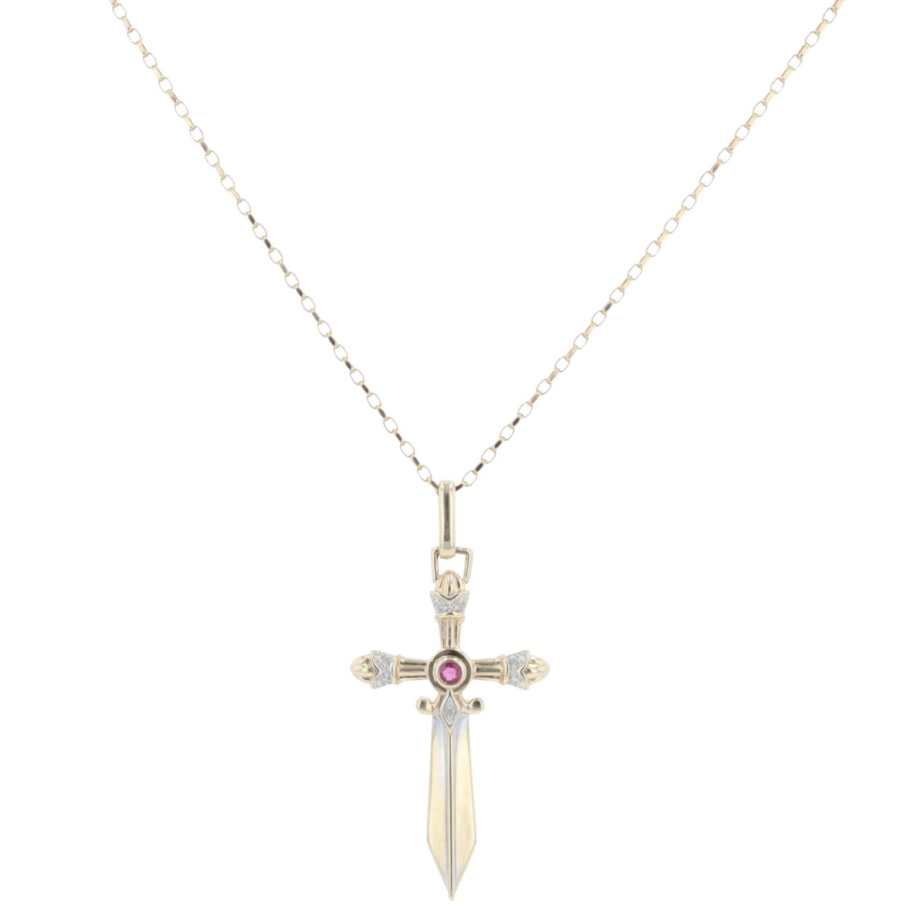 9ct Yellow Gold 0.05ct Diamond and Ruby Sword Pendant and Belcher Chain 20"