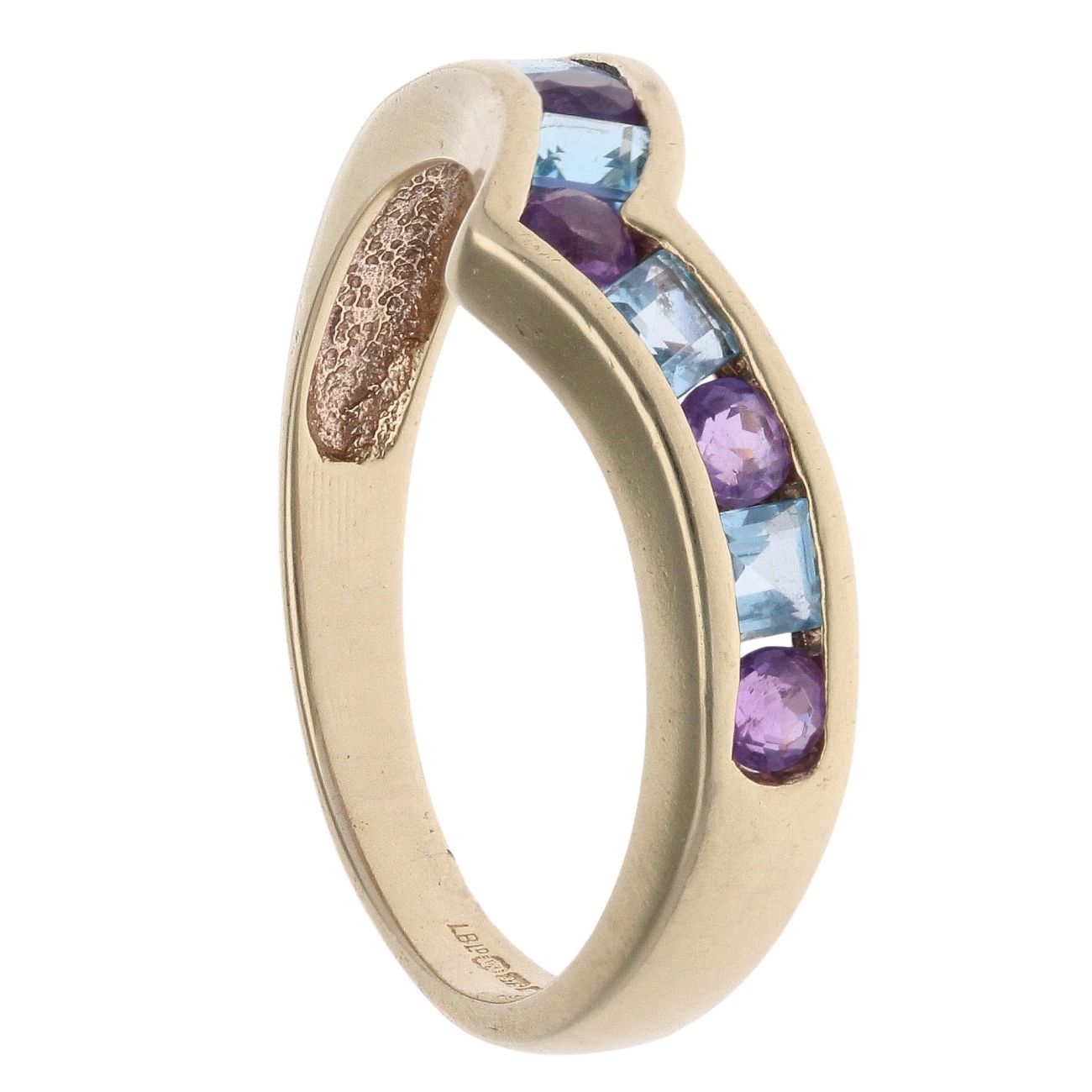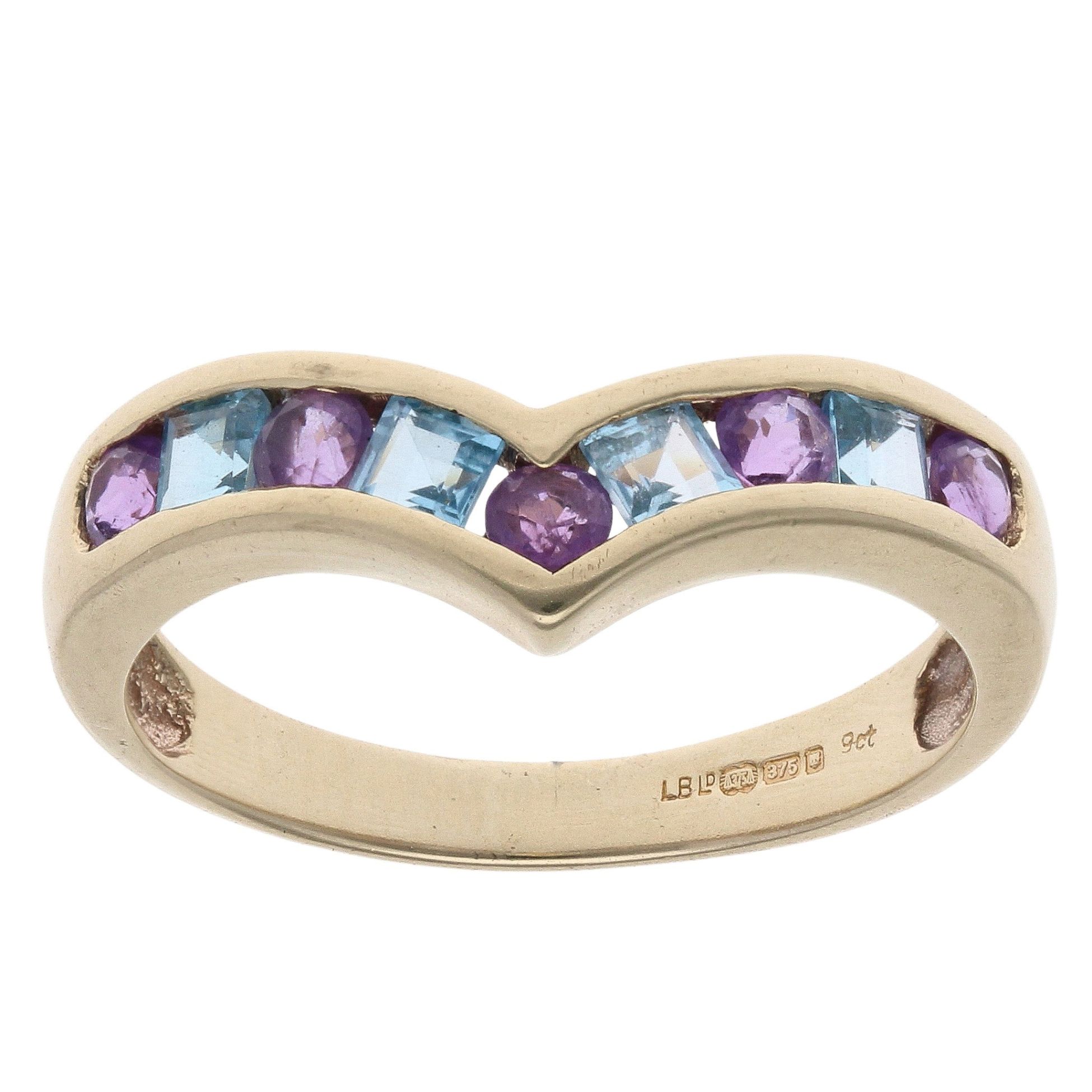 9ct Yellow Gold Blue Topaz and Amethyst Wishbone Ring