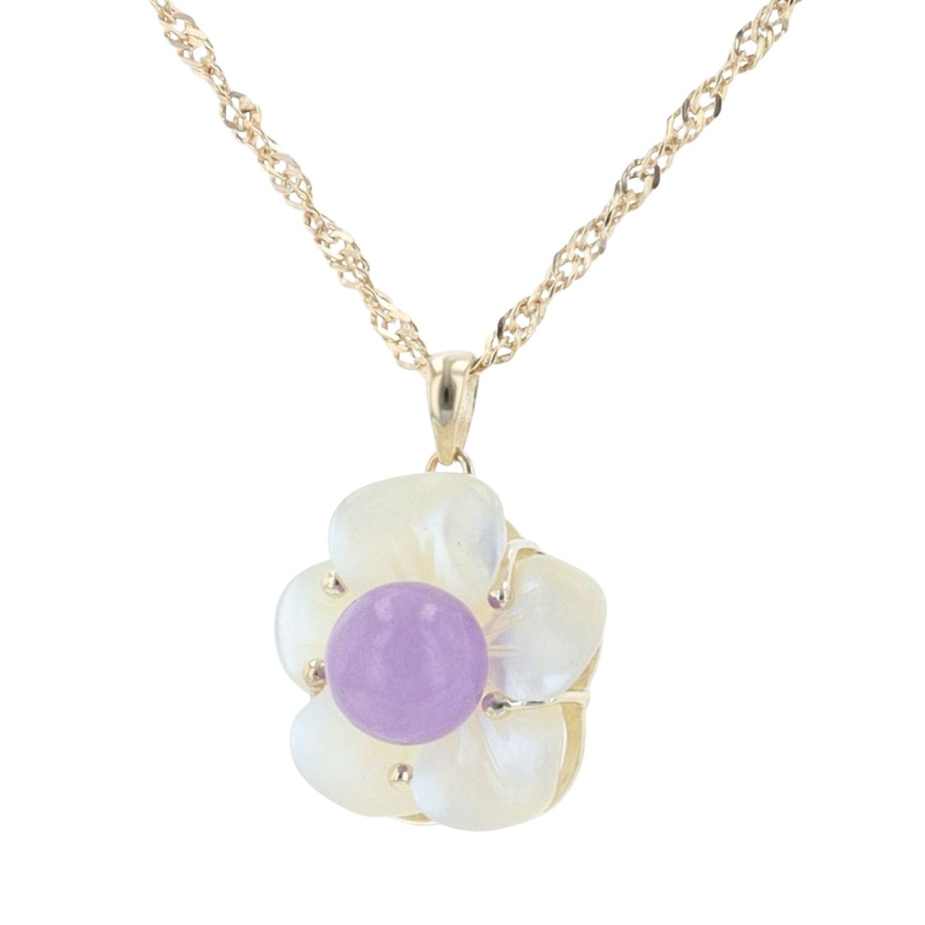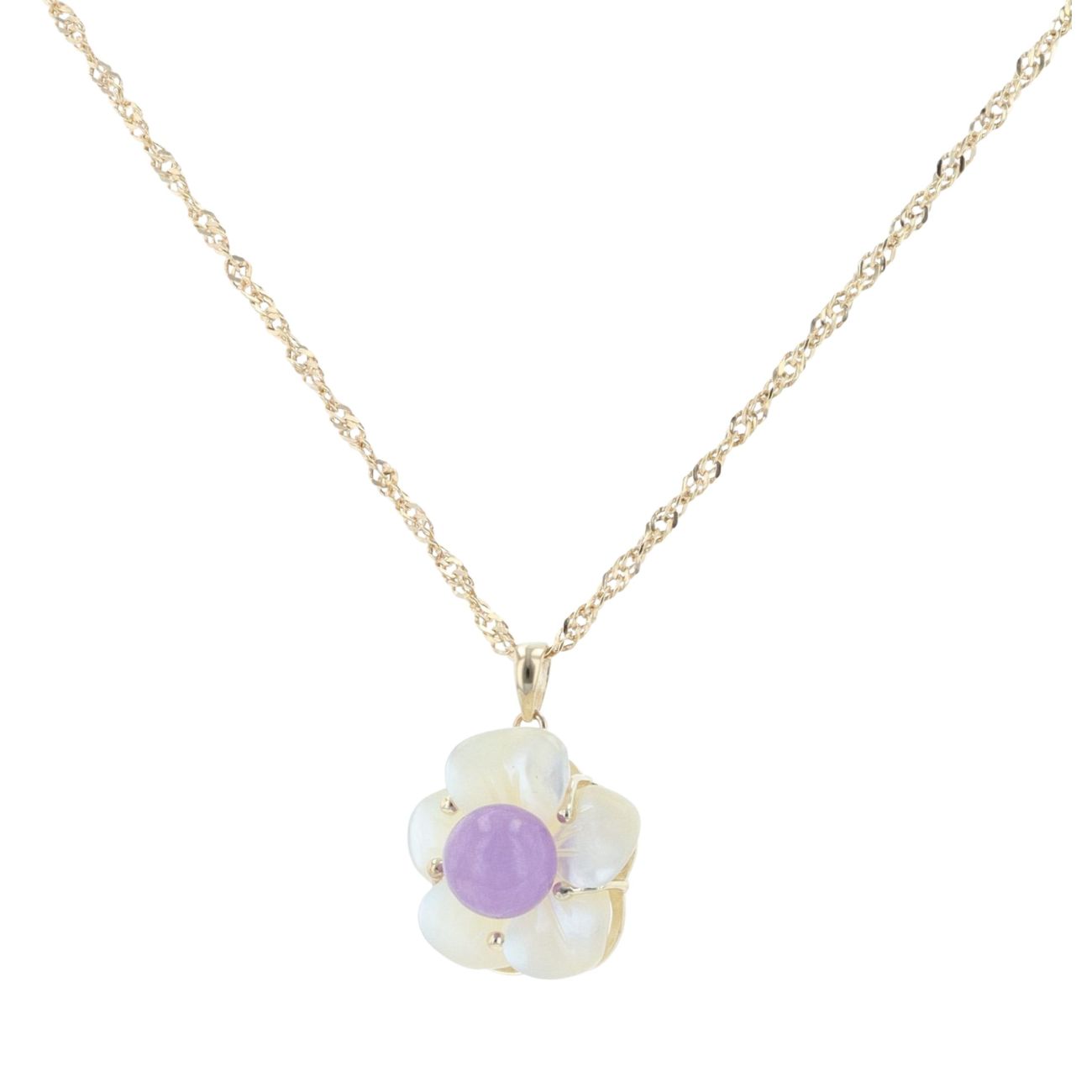 9ct Yellow Gold Mother Of Pearl And Lavender Jade Flower Pendant And Chain 20"