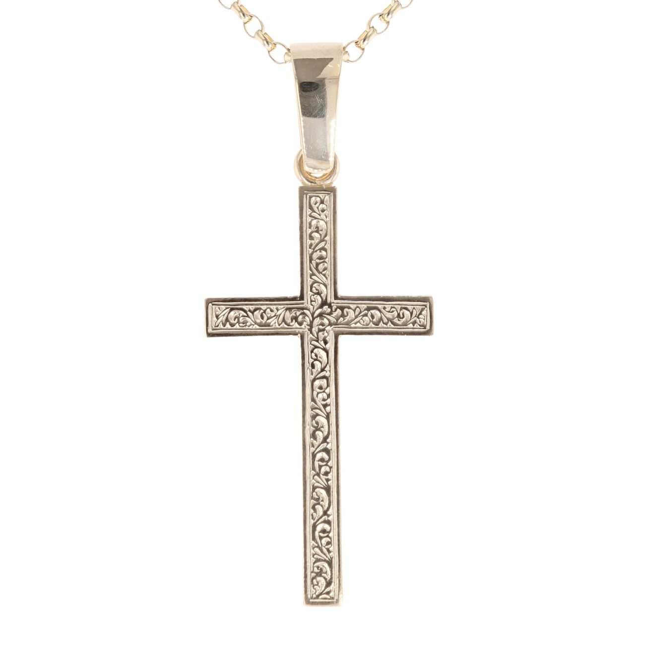 9ct Yellow Gold Patterned Cross Pendant and Belcher Chain 24"