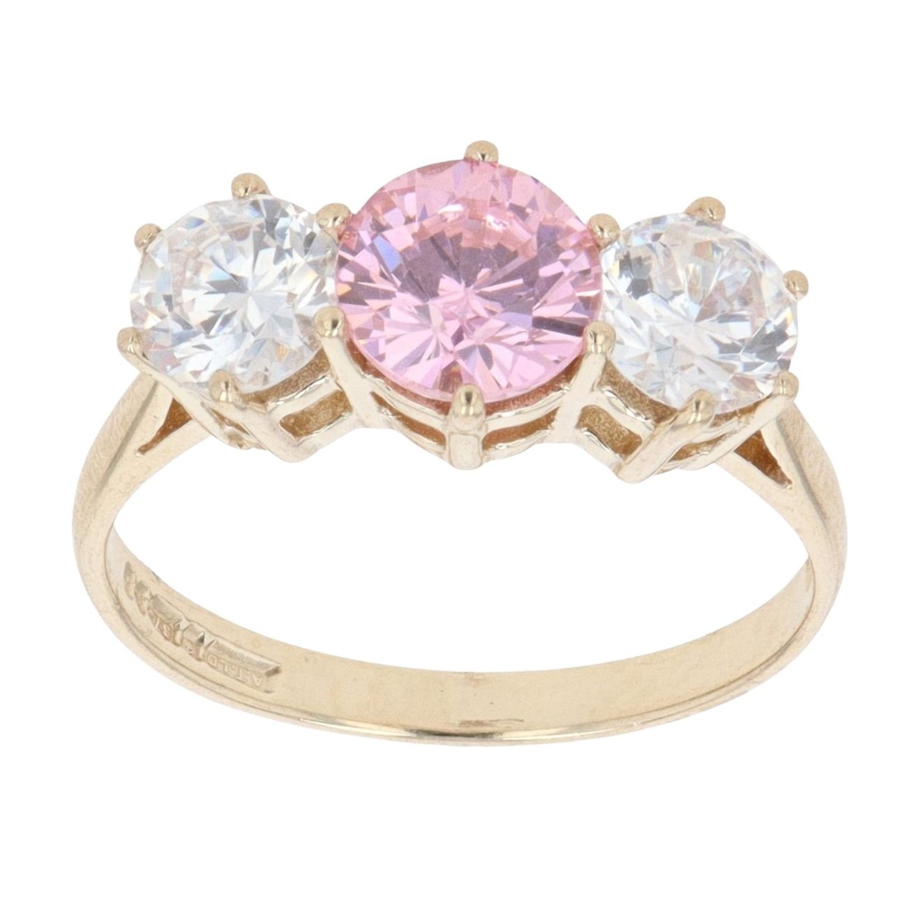 9ct Yellow Gold Pink Gemstone And Cubic Zirconia Three Stone Ring