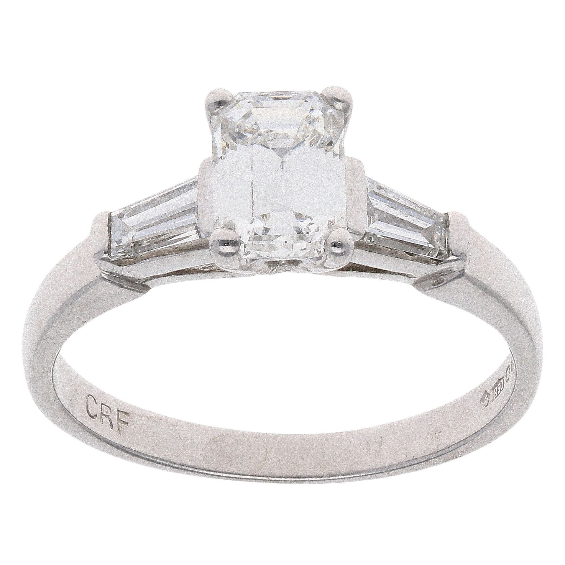 Platinum 1.00ct Emerald and Tapered Cut Diamond Solitaire Ring