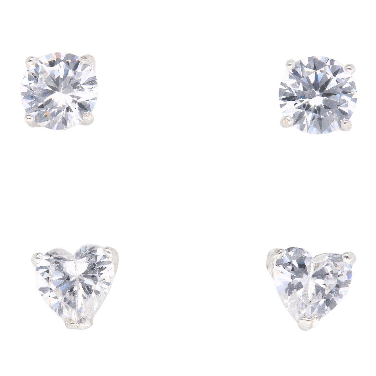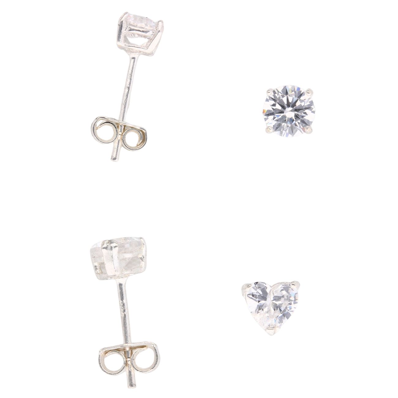 Silver Cubic Zirconia Heart and Round Stud Earrings Set of Two